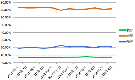 1、截至 2014 年 5 月,统计数据显示,在百度网页搜索发现的海量网页中,优质网页仅占 7.4%,质差网页高达 21%,其余普通网页为 71.6%。